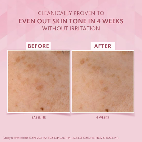 REDUCES DARK SPOTS AND EVENS SKIN TONE IN 4 WEEKS: This formula visibly corrects dark spots, evens skin tone, and enhances brightness without causing irritation or compromising the skin barrier.