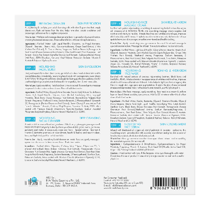 Step 1 CLEANSING MILK (SKIN PURIFICATION) : Wet face and massage cleanser onto face in upward and outward motion, avoiding the immediate eye area. Rinse well and follow with nourishing facial scrub.