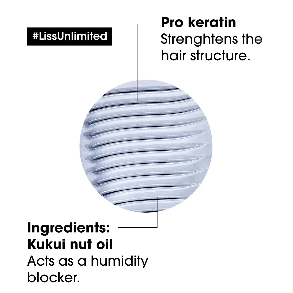 Introducing L'Oreal Professionnel Liss Unlimited Shampoo, enriched with Pro-Keratin and Kukui Nut Oil. This expertly crafted shampoo offers unparalleled frizz control, ensuring your hair remains smooth and manageable in any weather. Perfect for those struggling with unruly, frizzy hair, this formula delivers lasting smoothness and shine, making every day a good hair day. Experience the transformative power of advanced haircare that tames and nourishes.