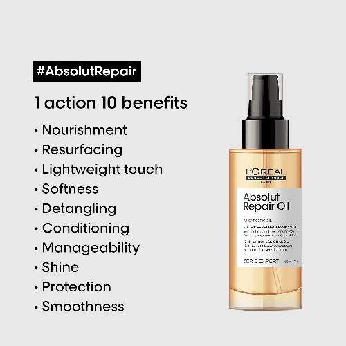 L'OREAL PROFESSIONNEL PARIS Absolut Repair Hair Oil For Dry & Damaged Hair, 90ml 10-In-1 Multi-Benefit Leave-In Hair Oil With Wheat Germ Oil