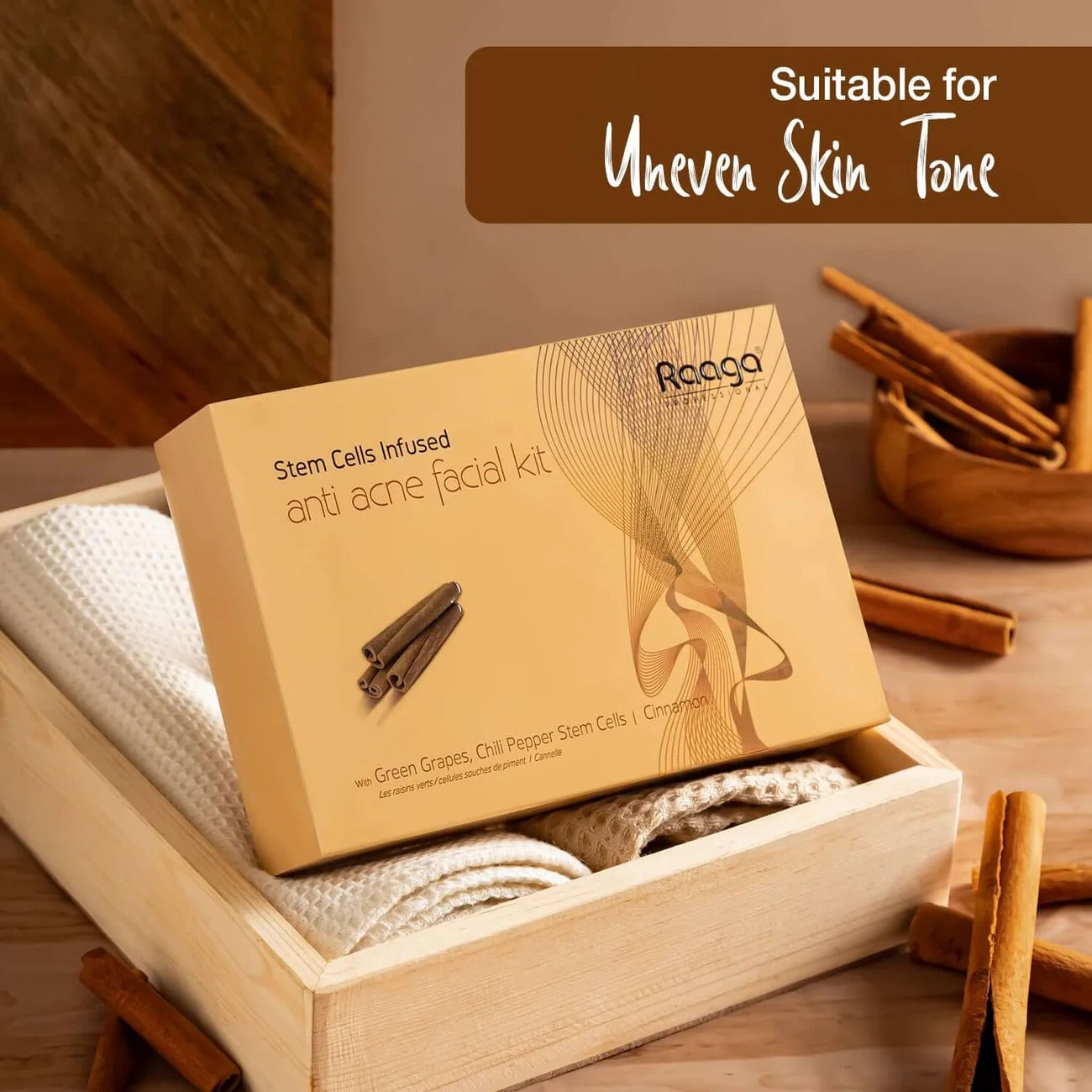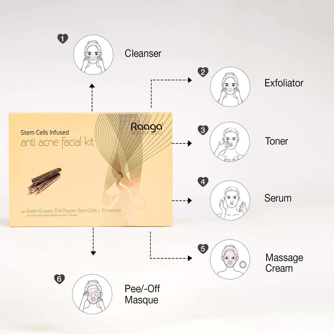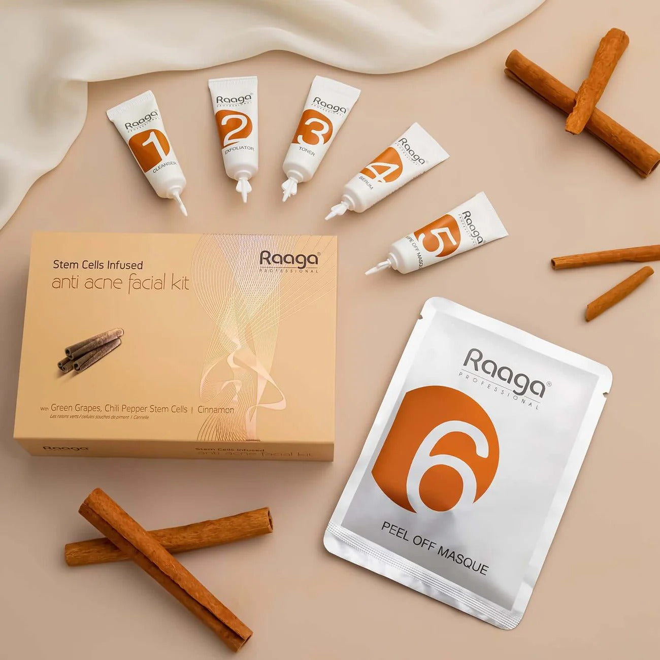 Raaga Professional Anti-Acne Stem Cells Facial Kit – 6 Step Advanced Treatment with Cinnamon, Green Grape & Chilli Pepper Stem Cells | Fights Inflammation & Clears Acne – 61 gm