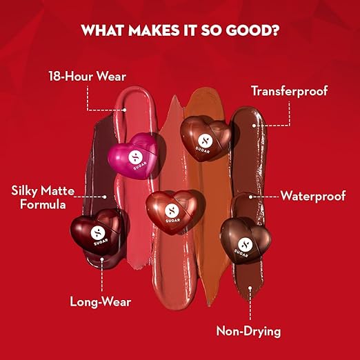 Introducing the SUGAR Limited-Edition La La Love 18HR Liquid Lipstick, available in four stunning shades. These long-wearing liquid lipsticks provide a rich, matte finish that lasts up to 18 hours. Each shade is designed to deliver intense pigmentation and a comfortable, lightweight feel.
